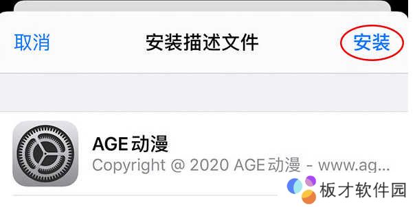 4、找到AGE动漫的描述文件,点击右上角的安装。