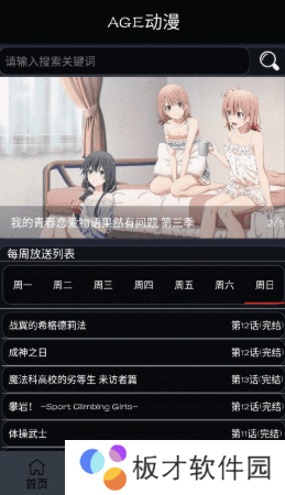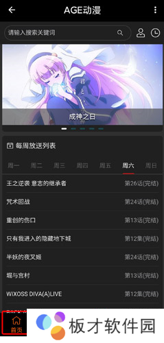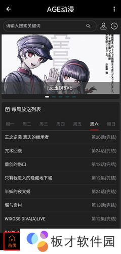 1、首页页面:会进行每周放送,可以查看到每天的动漫更新情况;