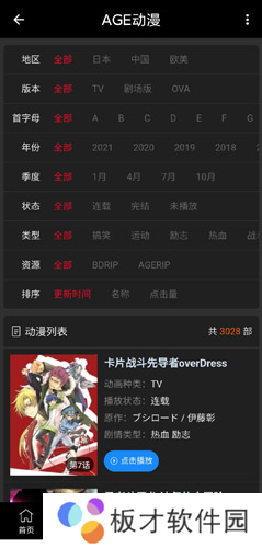 2、目录页面:会对动漫进行地区、版本、首字母、年份、季度等排列,方便用户寻找;