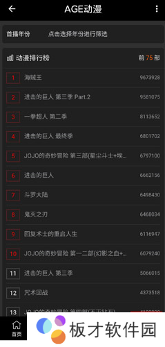 5、排行榜页面:会将每一年的前75部动漫进行排列。
