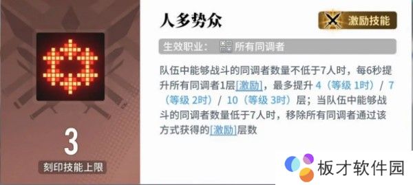 1、核心技能是人多势众,可以快速为角色提升激励。