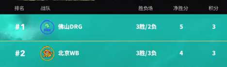 在昨晚的比赛里,北京WB3-0广州TTG拿到了自己的理论最高分3胜3负4净胜分。而佛山DRG目前是3胜2负5净胜分,今晚任意比分战胜武汉eStarPro即可锁定淘汰赛门票;如果2-3输给武汉eStarPro的话,则将和北京WB加赛;要是1-3或0-3输给武汉eStarPro的话,精英组第一的位置就只能拱手让人了。