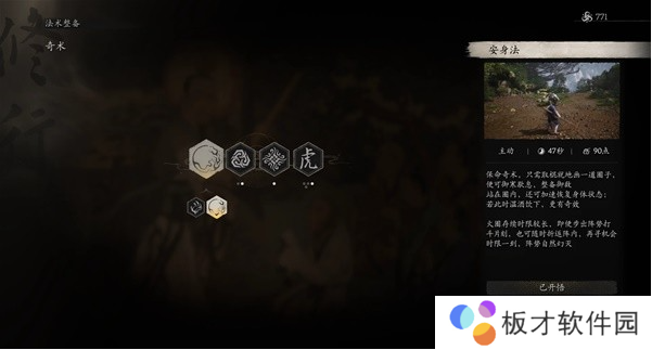 游戏中法术分为四类,分别是奇术、身法、毫毛、变身,玩家每次只能选择一个技能装备。