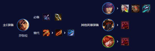 沙弥拉的特性导致非常需要暴击装备,轻语无尽是必备的,再补充一个攻速装备即可。厄加特和卡特需要到3的英雄带个偷偷无可厚非,肉装给到瑟提即可。