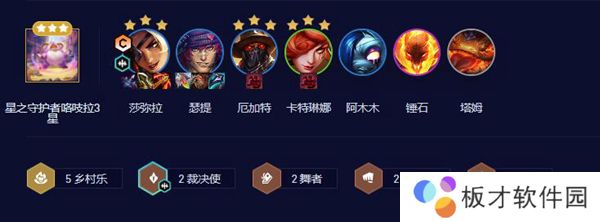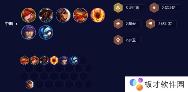 阵容羁绊:5多村乐、2裁决使、2舞者、2格斗家、2护卫