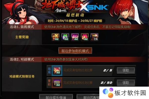 在地下城与勇士游戏中,在本次的活动中将会新增SNK联动活动,玩家们可在游戏中的地下城模式中选择街机模式,挑战模式,并且可以选择自己喜欢的角色进行挑战,挑战完成后会获得大量升级等级的加点值和丰富的活动奖励。