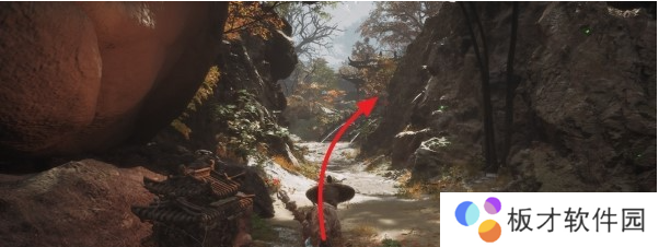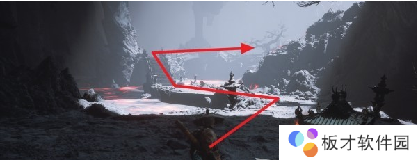 从第三回【小西天-浮屠界-经筒外】土地庙往BOSS【魔将·妙音】所在位置的桥走,到悬崖边右转可以看到前方岩壁上凸出了一些大石头,这些石头是可以踩着往下跳的。沿着石头往下跳,按照下图箭头方向前进。