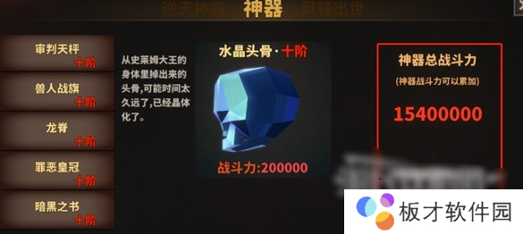 神器的升级机制非常简单,一共有10个神器,每个神器都需要材料解锁,解锁某个神器后使用金币升到10级满级,提供大量的战力。