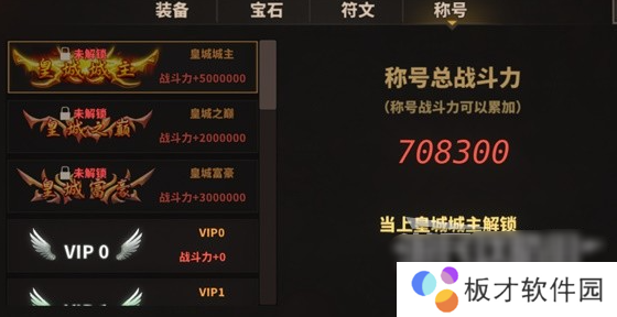 除了充值获得的VIP0-15的称号外还有三个特殊称号,充值金额到达50万即可解锁皇城富豪称号,在竞技场到达王者段位获得皇城之巅称号,在游戏后期成功拿下皇城获得皇城城主的称号。