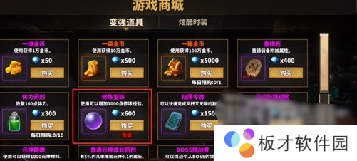 修炼经验值需要从右上角的“游戏商城”的变强道具一栏,购买“修炼宝珠”获得。