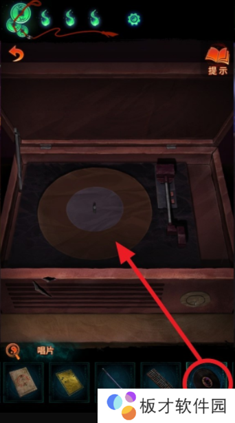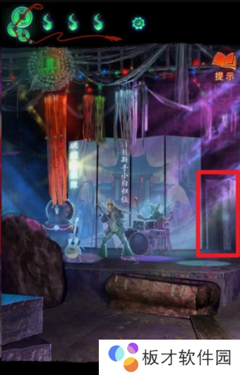 返回**殿入口,点击界面左边的唱片机,选择道具栏中的【唱片】放入唱片机,然后全场纸人开始蹦迪,回到远景观察**殿门口三个纸人的手,会指着3个被灯光打到的字。