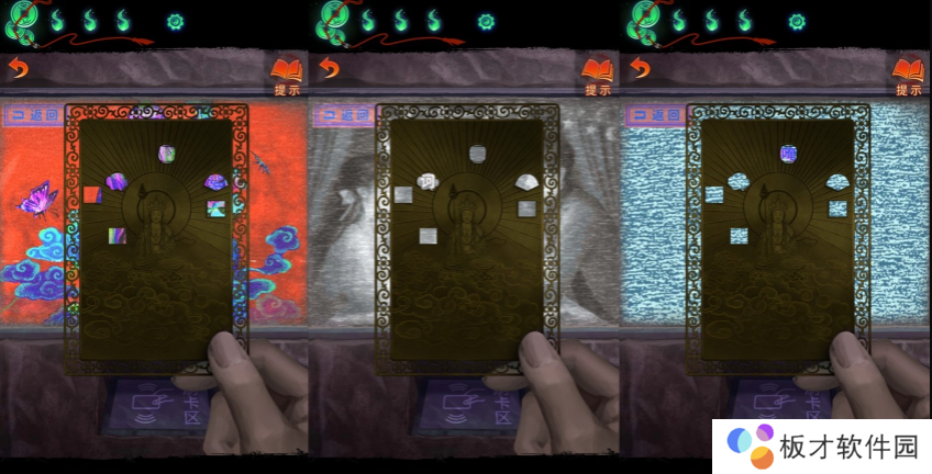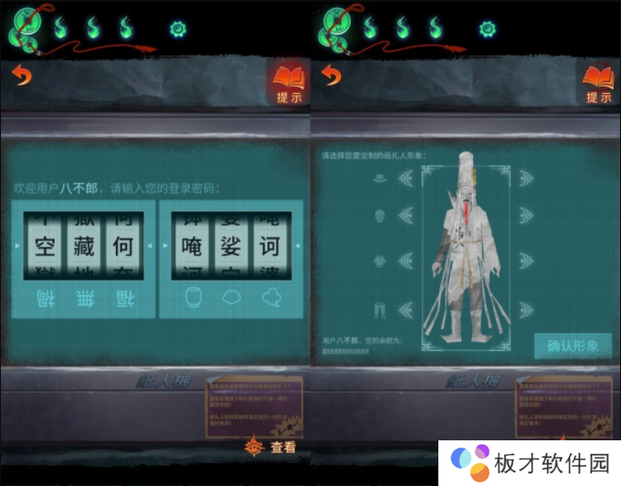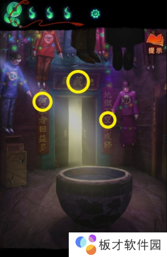 再次进入阴乐厅,点击屏风后面的纸人机,分别输入刚才在**殿门口和左侧大石头上拿到的密码,参考下图【空藏何-唵娑诃】。