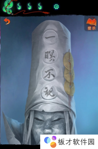 切换回远景,发现白无常的纸人已经出现在舞台上,点击白无常,再选择道具栏中的【毛笔】,在白无常的帽子上写出正确的四个字(参考下图)。