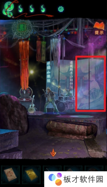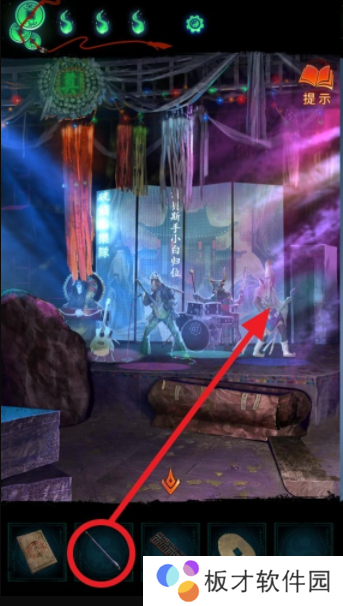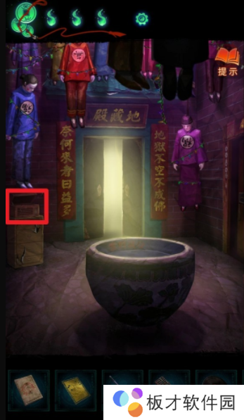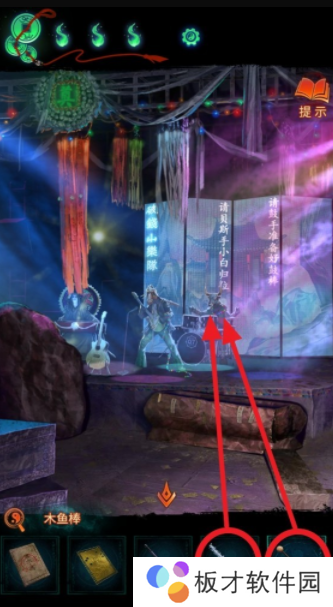 切回远景,选择道具栏中的【木鱼棒】和【哭丧棒】交给舞台上的牛头。移动后方屏风,出现纸人机。