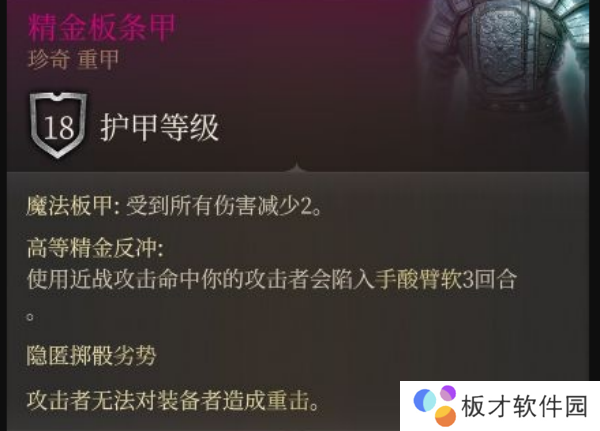 2、而精金板条甲又给玩家提高很高的防御力,因为精金板条甲本身的防御力数值加成就已经很高了,词条效果又能让敌人无法对装备者造成重击伤害,被近战攻击还会让敌人陷入手软debuff三回合。