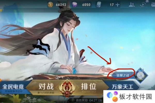 答:王者荣耀觉醒之战在游戏主界面万象天工上方,点击进入即可玩。