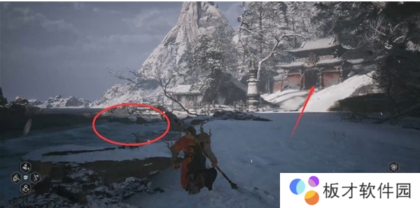如果你回到安身寺,重走一遍刚才的路,滑下雪坡后,发现之前停靠在南岸的龟岛已经离开(因为现在已经停靠在北岸了),并在岸边发现“苦海南岸”土地庙。