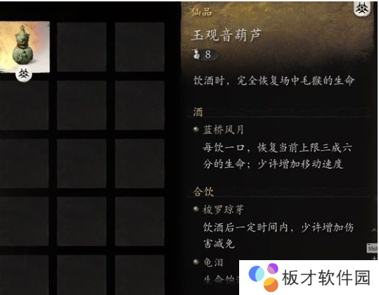 玉观音葫芦是游戏中的一个道具,这个道具的作用是饮酒时,完全恢复场中毛猴的生命。