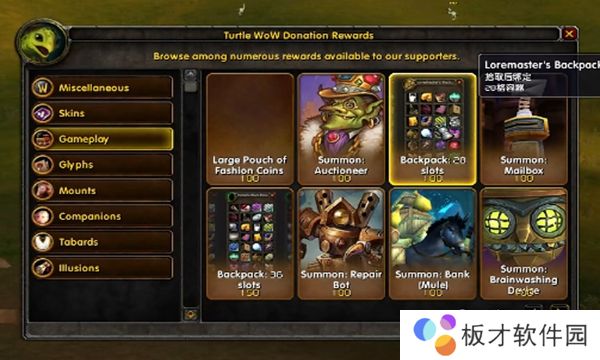 商店内可购买的种类有改名、种族皮肤、杂项道具、德鲁伊的皮肤、坐骑、宠物、幻化。