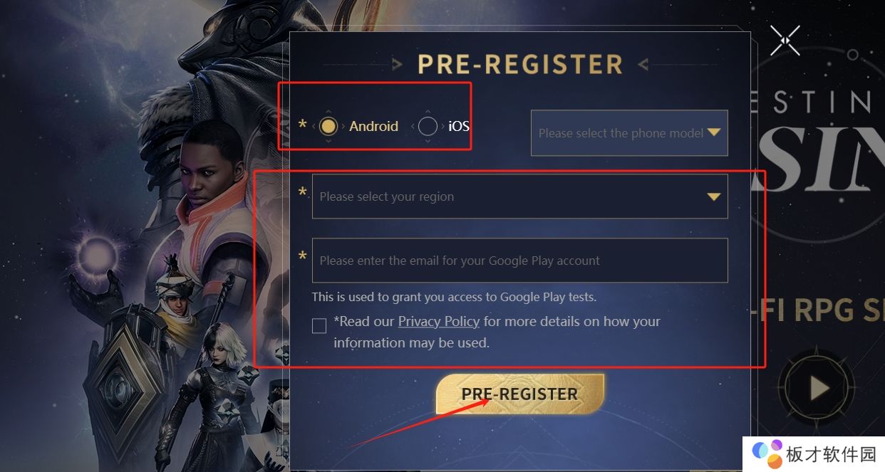 2、选择预约渠道,输入设备型号以及住址,再填写游戏点击“pre-register”预约即可。