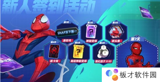 公测开启后,玩家只需每日登录,即可领取国服专属称号-"SNAP天下第一",蜘蛛侠头像,蜘蛛侠卡背以及高级神秘变体。