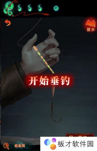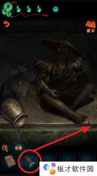 返回算命摊所在区域,点击界面右下角的钓鱼佬,选择道具栏中的【纸鱼】挂在他鱼竿的钩子上,然后从他身边的罐子里拾取【纸鱼饵】。