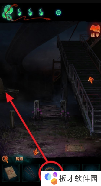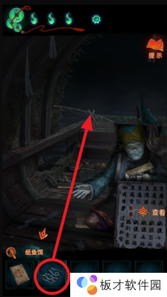 从桥上获得【钩爪】后,回到桥下之前坏道士所在区域,选择道具栏中的【钩爪】,把界面左侧的船拉到岸边,点击上船。在船上,选择道具栏中的【三根香】放入船上的香炉中。注意有高能。