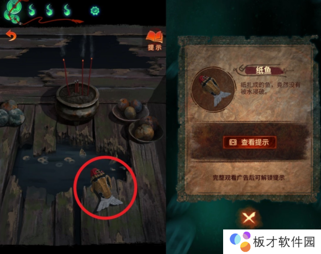 钓到绿色纸乌龟,查看龟壳上的纹路,获得龟甲点击顺序的线索。回到算命摊所在区域,从算命摊右侧大门上楼触发对话。对话完毕后点击左侧龟壳,按照纸乌龟上画的箭头顺序点击对应的龟壳。