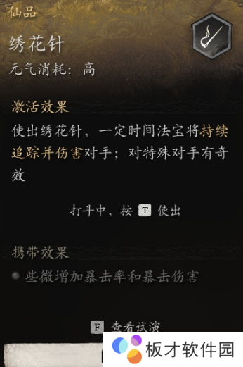 1. 绣花针作为一种独特的法宝,在战斗中展现出了其独特的能力。它能够追踪敌人并持续造成伤害,虽然这种伤害的效果相对较为有限,但它的主要作用在于打断百眼魔君的二阶段。在与百眼魔君的战斗中,绣花针发挥着至关重要的作用,帮助玩家有效地应对这个强大的敌人。