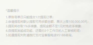 3、提现默认提取的金额是当前账户中全部可用余额,单次提现金额上限为100000元。