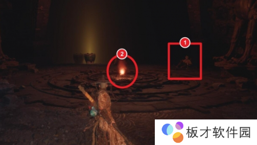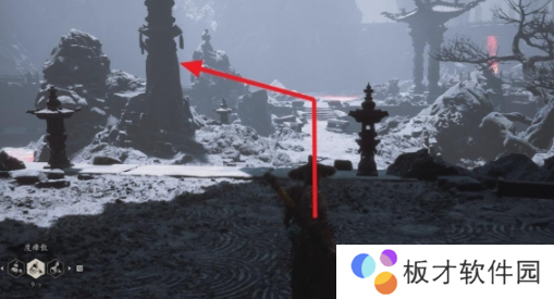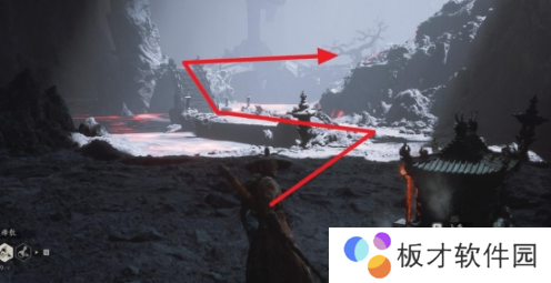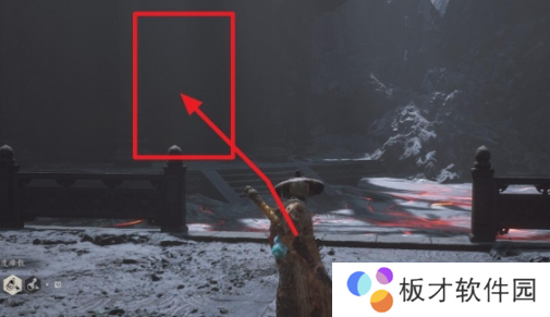 4.沿着左边的路走到尽头,你会看到一个黑色的宫殿。这个宫殿的位置如下图所示,它看起来神秘而古老,仿佛隐藏着无尽的秘密。进入宫殿大门,你会看到一团篝火在燃烧,旁边坐着一位葫芦道士。