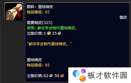 3、需要花费5金购买,物品等级为65,需要制皮325,使用后学会制作重结缔皮。