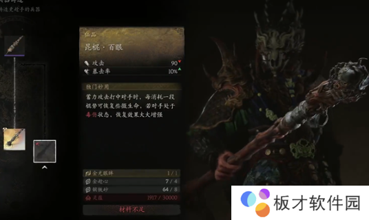 4. 收集材料:为了制作昆棍百眼,玩家需要收集以下材料:1枚金光眼眸、4枚金趁心、8枚镔铁沙和30000灵蕴。