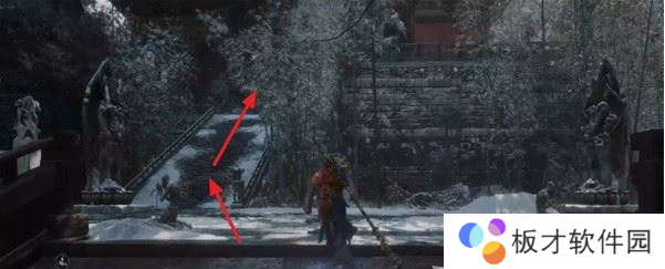 从地图庙小雷音寺寺门出发,先穿过中间房间,走到第一个楼梯上方然后往左边区域跳下去,