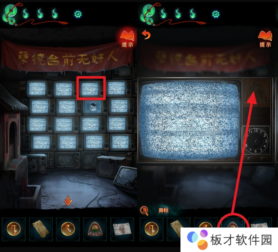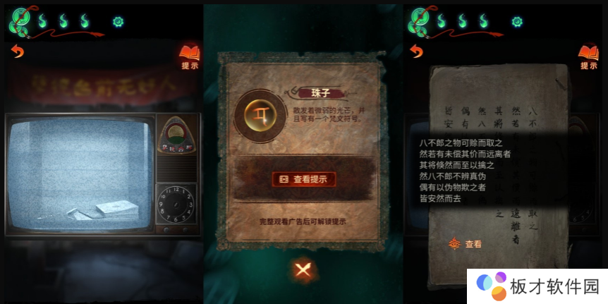 正确解谜后,从电视机里拾取【珠子】,珠子左右两侧还可以看到关于剧情的提示,右边是后半部分关于八不郎的描述,左边是写有坤为地的签。