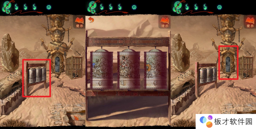 进入沙漠区域,界面中间有逆转的转经筒,记住与下方符号对应的带颜色的图案,然后进入笼子旁边的门。