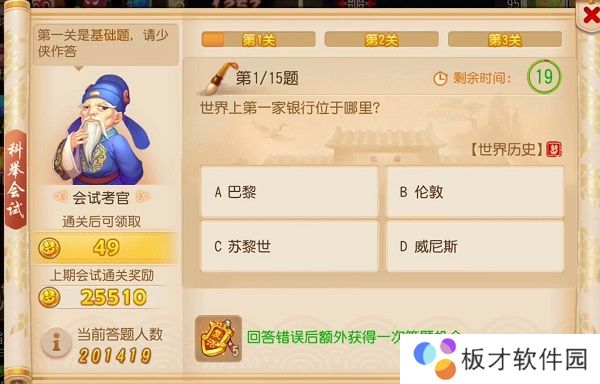 3、会试有20道题目,累计打错10题就直接出局,每打错1题会增加20秒用时,最后通关且用时最少的20位玩家能进入殿试。