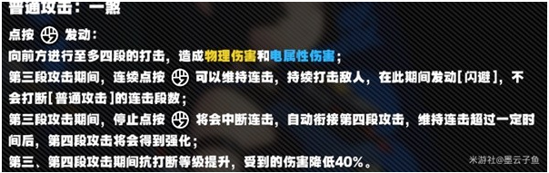 青衣的普攻输出手感上佳,通过在第三段攻击时进行连击可以快速打满失衡值或电属性异常条,为强攻位提供绝佳的输出空间,在连击进行时有一定范围的聚怪能力,同时提高抗打断能力及40%的伤害减免,极大的保障了青衣的续航