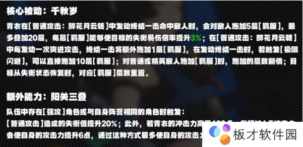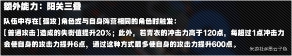 根据该额外能力,青衣的队伍中,至少存在一位强攻手,在提高青衣的失衡值的同时,还可以根据其提高于120点的冲击力的点数,吃到攻击力加成至多600点,为220的冲击力上限