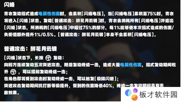 青衣在造成电属性伤害后可以积攒[闪络电压]具体可见,左上角角色图标下的横条,当[闪络电压]积攒到75%时,青衣进入[闪络]状态,通过长按攻击键发动五段重击[醉花月云转],造成不俗的伤害,攻击同时提高其抗打断能力,提供40%的伤害减免,最后一段有无敌效果