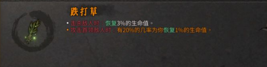 1号位搭配跌打草,击杀敌人时,恢复3%的生命值。
