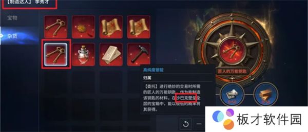 绝妙的交易:在NPC【制造达人】李秀才处,制造匠人的万能钥匙,在沙巴克堡垒,全地图都可以拾取宝箱获得原材料。