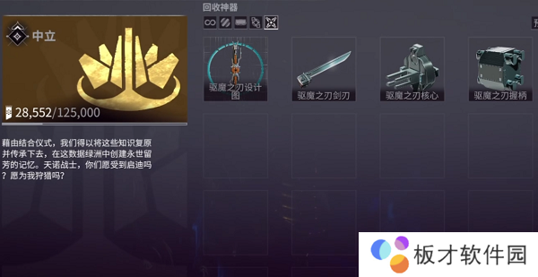 2、中枢Simaris处以100,000和15,000分别购买武器蓝图和部件。只然后就可以去合成驱魔之刃了。
