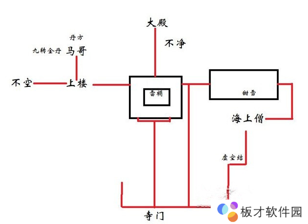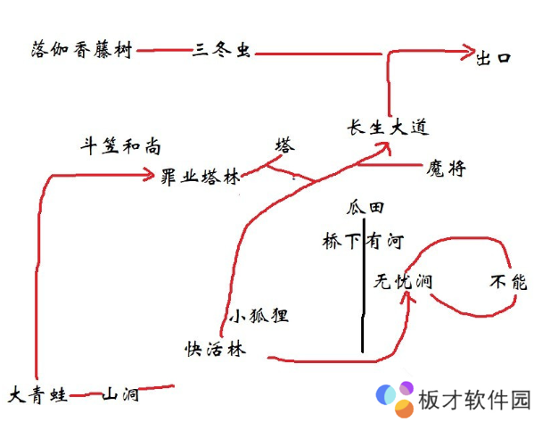 苦海:打亢金星君→龟岛土地庙→龟岛上钓鱼的青背龙→苦海北岸土地庙→左边打辰龙、救斗笠和尚→右边打无量蝠,调查蛇将骸骨,龟将落泪→回到龟将身边捡龟泪→找戌狗拿药,交给辰龙→进入如意画轴,申猴戌狗也在,辰龙种药材,挑战铁匠寅虎→戒语廊土地庙→【打坐蒲团】→亭子里遇到小和尚→拜四个佛找到上山的路→极乐谷