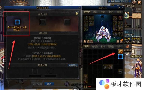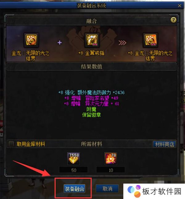 4、将需要融合的装备与材料放入对应卡槽后,点击装备融合按键即可完成装备的融合。