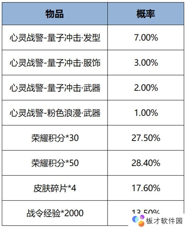 购买礼包必得酷炫机甲(1日),可额外随机获得以下之一:心灵战警-量子冲击·发型、心灵战警-量子冲击·服饰、心灵战警-量子冲击·武器、心灵战警-粉色浪漫·武器、荣耀积分x30/50、皮肤碎片x4、战令经验x2000。累计120次必得全部星元部件。