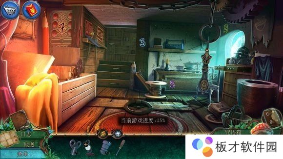 全屋墙面——用单片镜(先放在墙面数字7上,再移动到其他位子寻找数字)——找到前面隐形数字(看到数字需手动点亮)