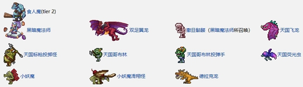 3、二级(T2):由七波敌人构成,在最后一波中有一个或多个食人魔作为小 Boss,在这一级别中不会出现黑暗魔法师,如果玩家已打败了至少一个机械 Boss 的困难模式世界中召唤此事件触发的是二级。