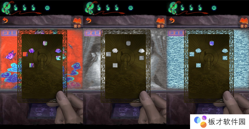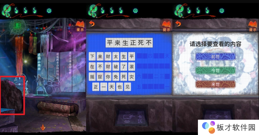分别查看前世、今世和来世的内容,使用道具栏中的金色卡片,获得字与对应的形状。这是后面密码锁的答案。