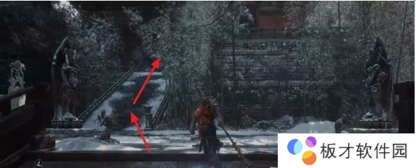 从地图庙小雷音寺寺门出发,先穿过中间房间,走到第一个楼梯上方然后往左边区域跳下去,
